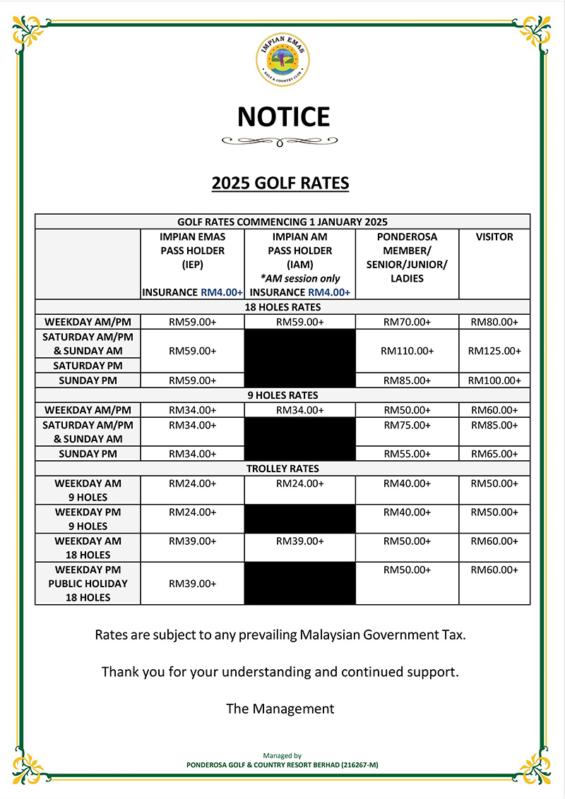 Impian Emas Golf & Country ClubManaged by Ponderosa Golf & Country Resort Bhd (216267-M)Notices |